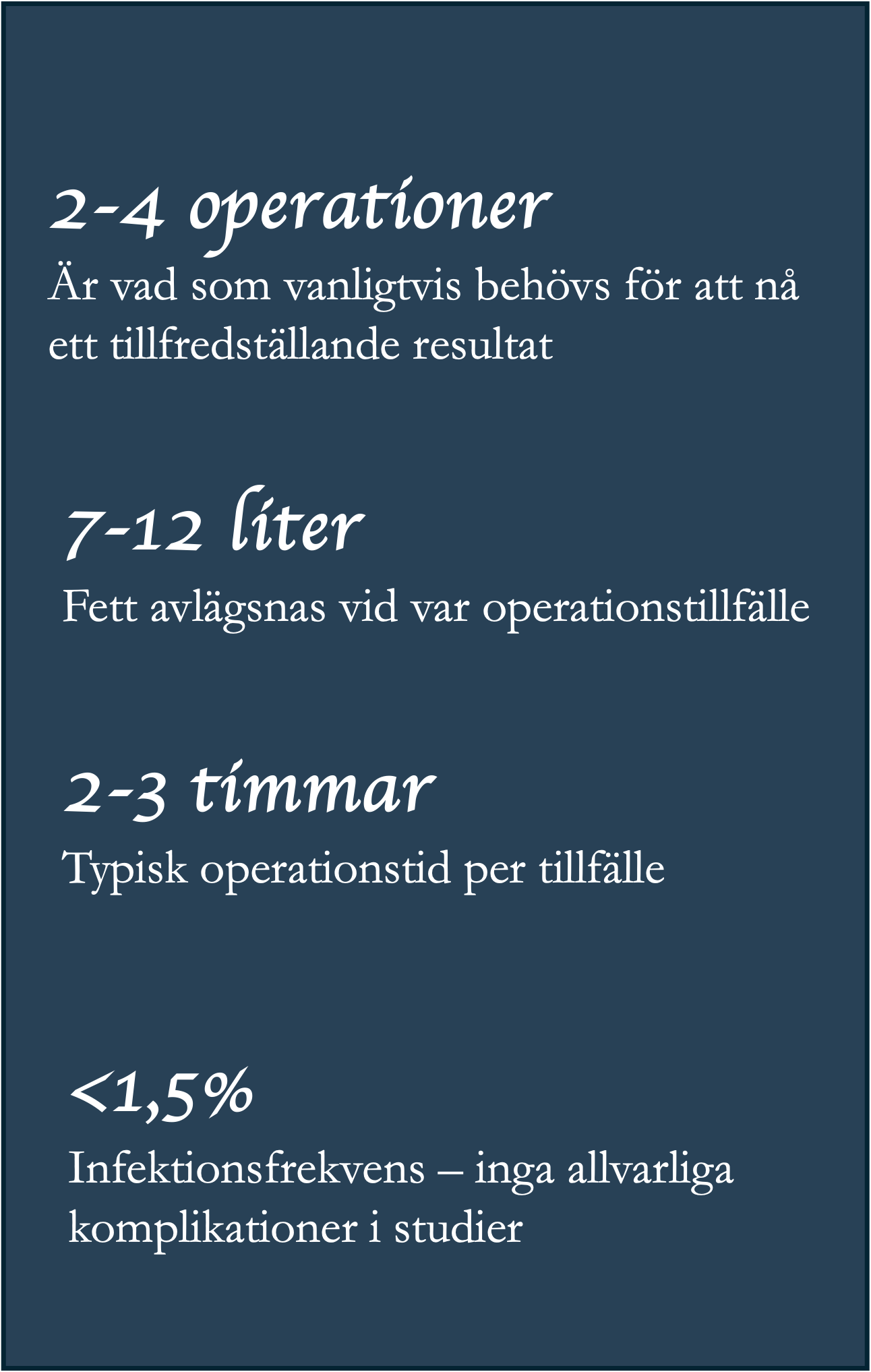 Fettsugning vid lipödem är ett medicinskt ingrepp – inte ett kosmetiskt. Målet är att ta bort det sjuka fettet som orsakar din smärta och begränsar din rörlighet. Att resultatet ofta även innebär ett förbättrat utseende är en välkommen bonus – men aldrig syftet.